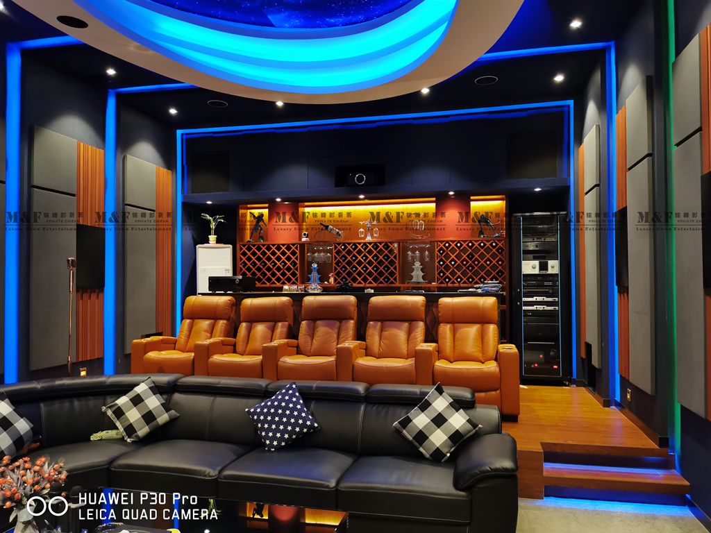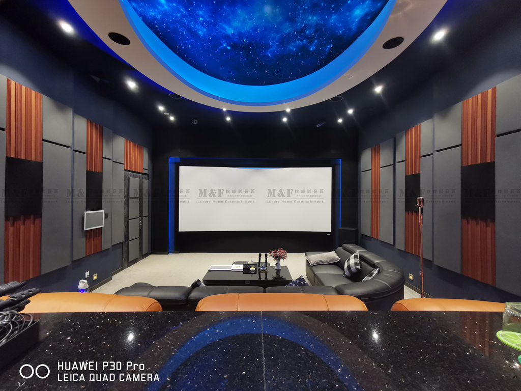 這是一個綜合娛樂的影音室既能看電影又可以KTV,整體別致大氣,既時尚又專業,一看就能看出來有很強的聲學設計功底.