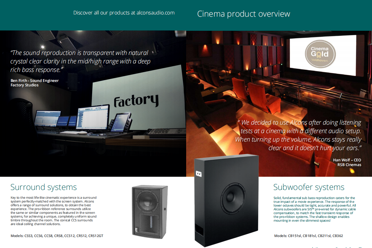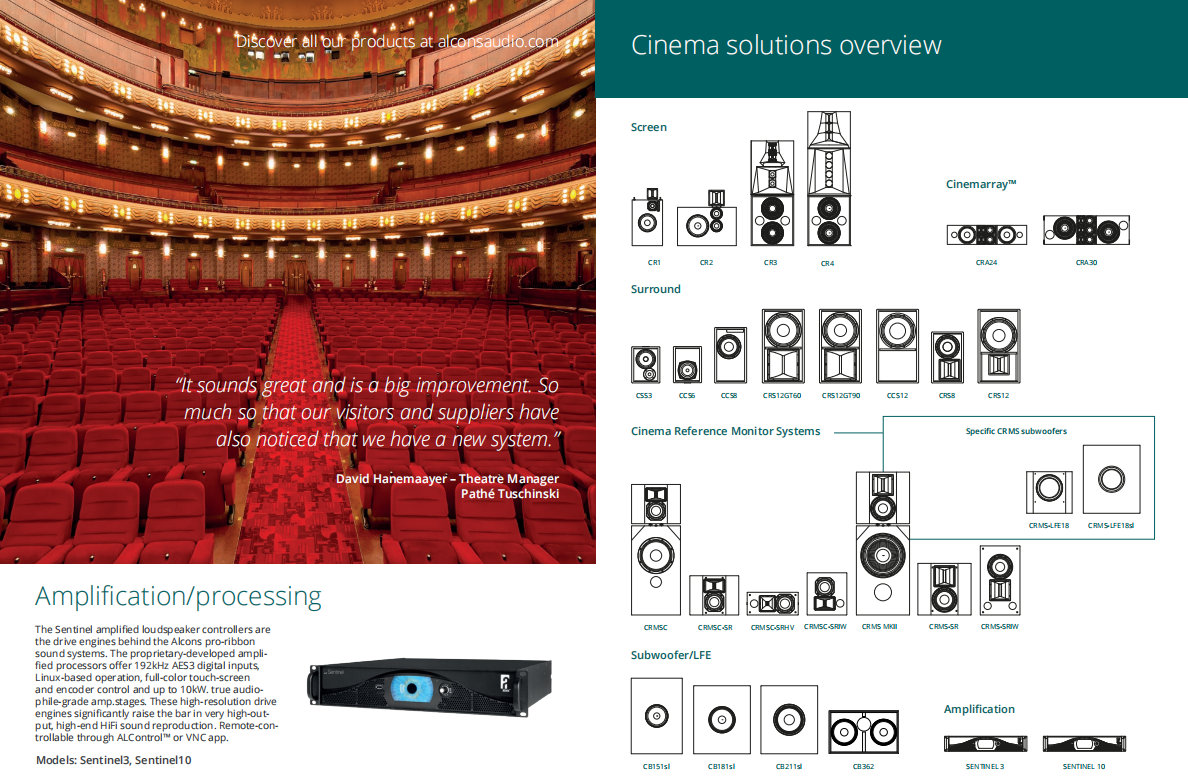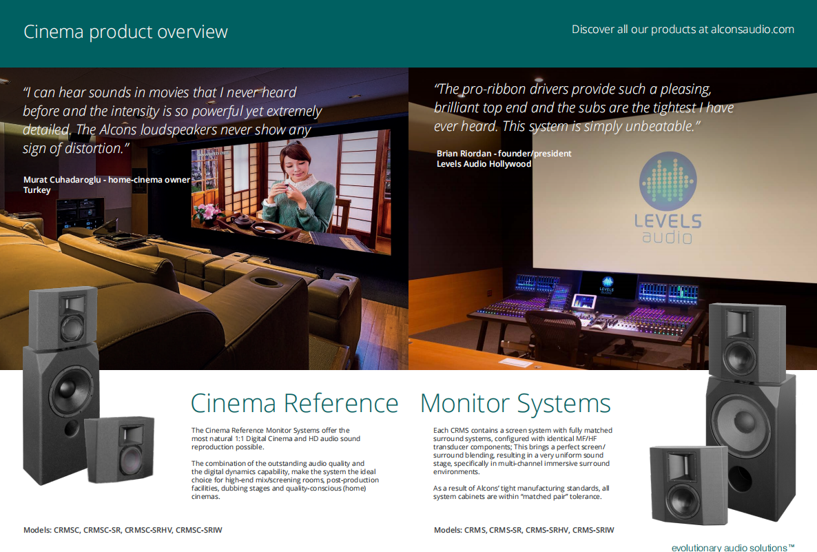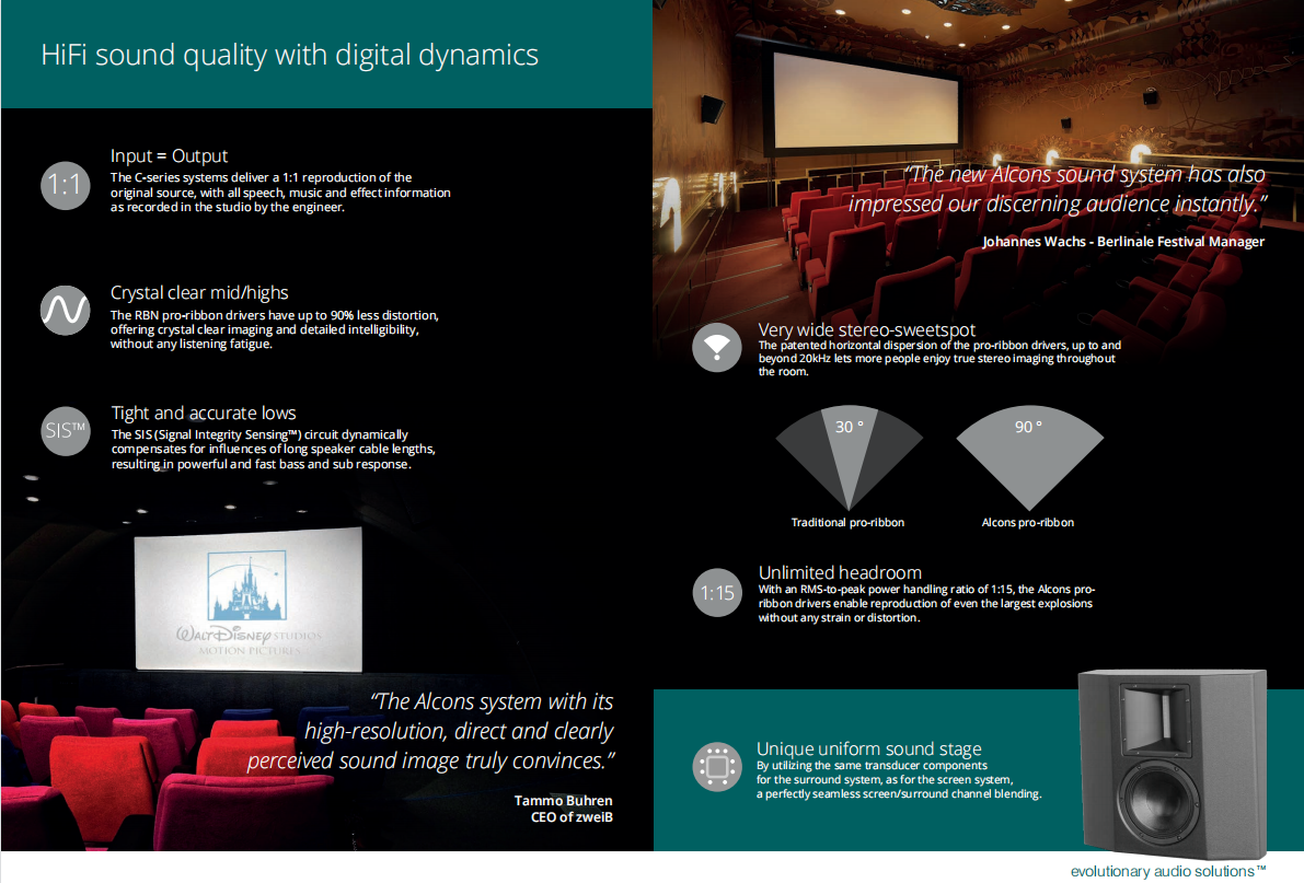 Alcons團隊把這一杰出成果應用到數字影院音響系統——C系列。C系列能提供HiFi聲質以及完美的清晰度,讓觀眾長時間觀看電影都不會出現聽覺疲勞。聲壓級覆蓋整個空間,大大提升遠離屏幕的觀眾聽覺上的享受,讓所有觀眾都能感受身臨其境的效果,讓觀眾與電影更親近。