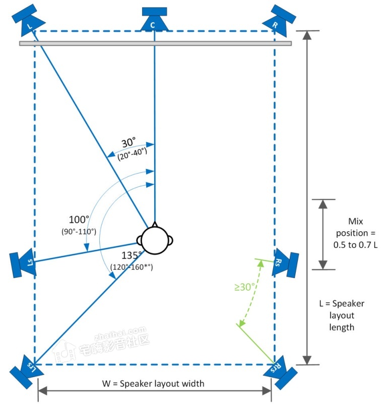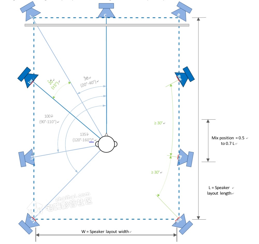 在擴大結(jié)構(gòu)時,可以增加多達四個揚聲器選項: 增寬揚聲器 側(cè)面環(huán)抱陣列 后環(huán)抱陣列 附加的頂部環(huán)抱揚聲器或頂部環(huán)抱陣列 您可以相互自力地擺設(shè)揚聲器選項,而且可以將一切擴大結(jié)構(gòu)選項利用于等距或正交結(jié)構(gòu)。 在設(shè)想擴大結(jié)構(gòu)之前,請先優(yōu)化基座7.1.4結(jié)構(gòu),以合適揚聲器結(jié)構(gòu)設(shè)想的指導原則。完成根基優(yōu)化后,可以斟酌擴大結(jié)構(gòu)及其指導原則。 5、增寬音箱 您可以在7.1.4結(jié)構(gòu)中增加增寬環(huán)抱揚聲器,以建立9.1.4揚聲器結(jié)構(gòu)。在9.1.4杜比全景聲設(shè)備中,有六個標準平面環(huán)抱揚聲器。建立9.1.4結(jié)構(gòu)的附加揚聲器為左寬(Lw)和右寬(Rw)。 兩個首要的設(shè)想方面安排著增寬環(huán)抱聲揚聲器的位置: 水平角度放置和相鄰揚聲器之間的角度間隔 所需的增寬環(huán)抱揚聲器仰角,與混音位置成一定角度 增寬環(huán)抱聲揚聲器應與其他環(huán)抱聲揚聲器音調(diào)類似,并合適所需的聲壓級別(SPL)標準。 6、增寬環(huán)抱式揚聲器水平角度 利用增寬環(huán)抱揚聲器時,要斟酌房間設(shè)想、揚聲器位置和結(jié)構(gòu)范例,以到達適當?shù)乃浇嵌取?br style="overflow-wrap:break-word;" /> 利用增寬環(huán)抱聲揚聲器時,以下原則適用: 在挑選增寬環(huán)抱揚聲器的位置之前,請回首屏幕、側(cè)面環(huán)抱、后部環(huán)抱和頂部環(huán)抱揚聲器的理想位置和指導原則。有關(guān)具體信息,請參閱房間設(shè)想尺寸、技術(shù)術(shù)語、根基道理和揚聲器結(jié)構(gòu)設(shè)想。 增寬環(huán)抱聲揚聲器的理想和倡議的水平位置,以與混音位置的角度來丈量,是以左右揚聲器的角度為根本,并取決于結(jié)構(gòu)是等距的還是正交的: 對于等距結(jié)構(gòu),理想的增寬環(huán)抱位置是經(jīng)過向中置揚聲器和左揚聲器之間的角度增加15°來計較的。倡議公役± 5°。 對于正交結(jié)構(gòu),理想的增寬環(huán)抱位置是經(jīng)過在中置揚聲器和左揚聲器之間的夾角上加20°來計較的。倡議公役± 5°。 這些圖顯現(xiàn)了每種結(jié)構(gòu)范例的揚聲器位置。有關(guān)結(jié)構(gòu),請參閱響應的圖。