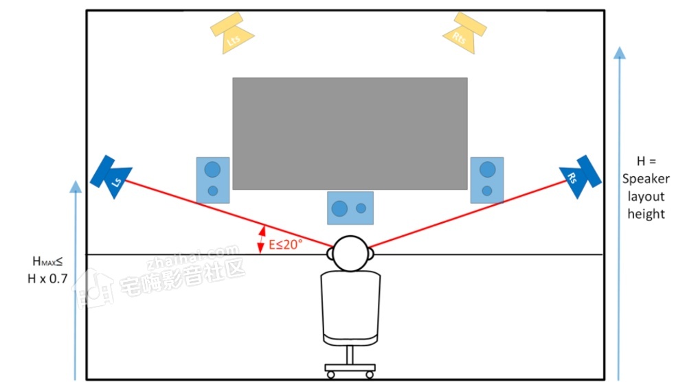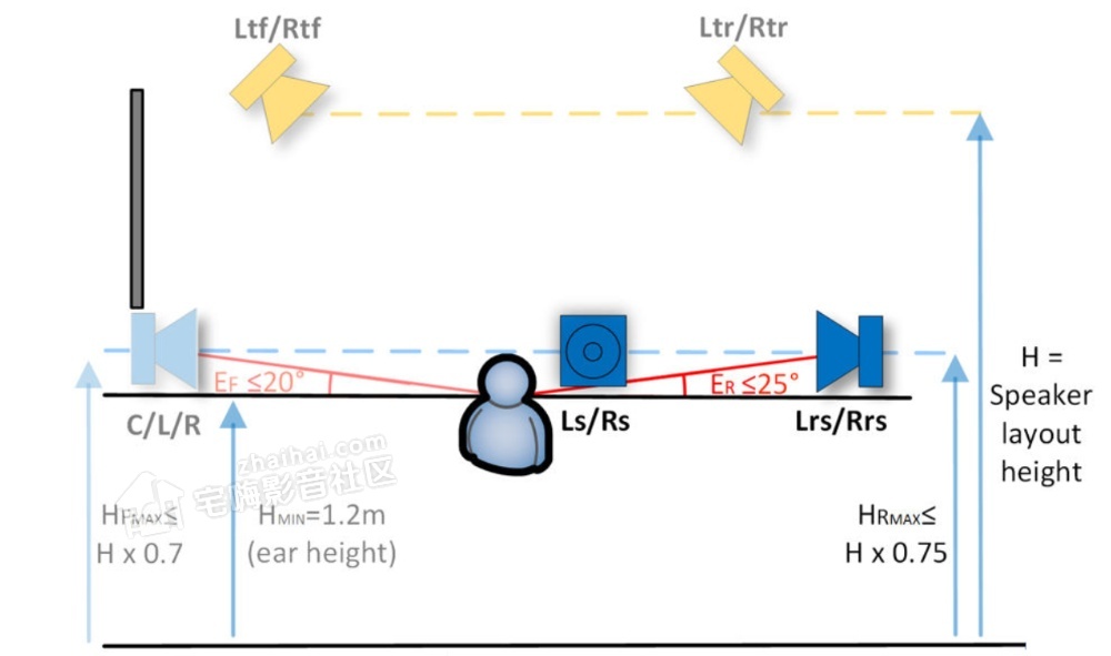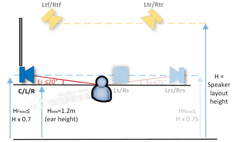 向后環(huán)抱揚聲器的仰角不應大于25°。 后環(huán)抱高度不應大于0.75乘以房間高度。 圖6:顯現(xiàn)后環(huán)抱揚聲器位置的側(cè)面仰角圖