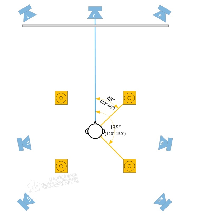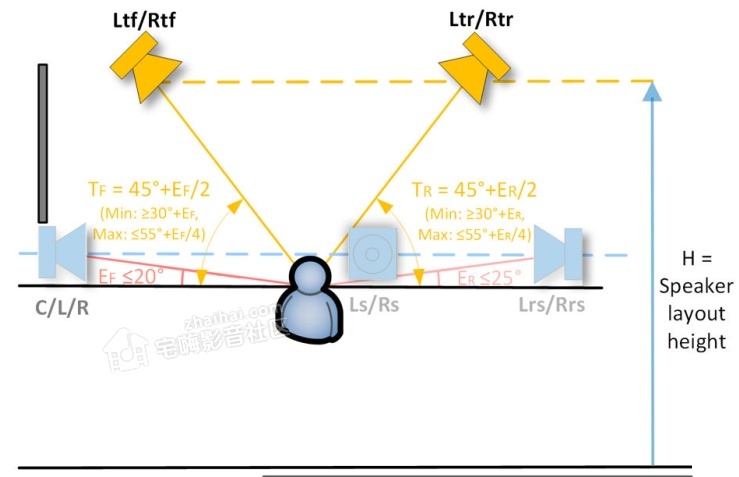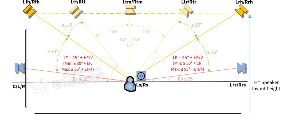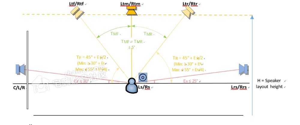 前頂從水平環(huán)抱的理想角度為45˚+(EF ÷ 2),其中EF是屏幕揚聲器從水平偏向的仰角。 喇叭應當放在應盡能夠接近理想的位置;可是,倡議的與前頂部環(huán)抱式揚聲器相向的角度范圍是: 最小:30˚+EF 最大:55˚+(EF ÷ 4) 后環(huán)抱位置的理想和限制是不異的,只是與后環(huán)抱的角度稱為ER。