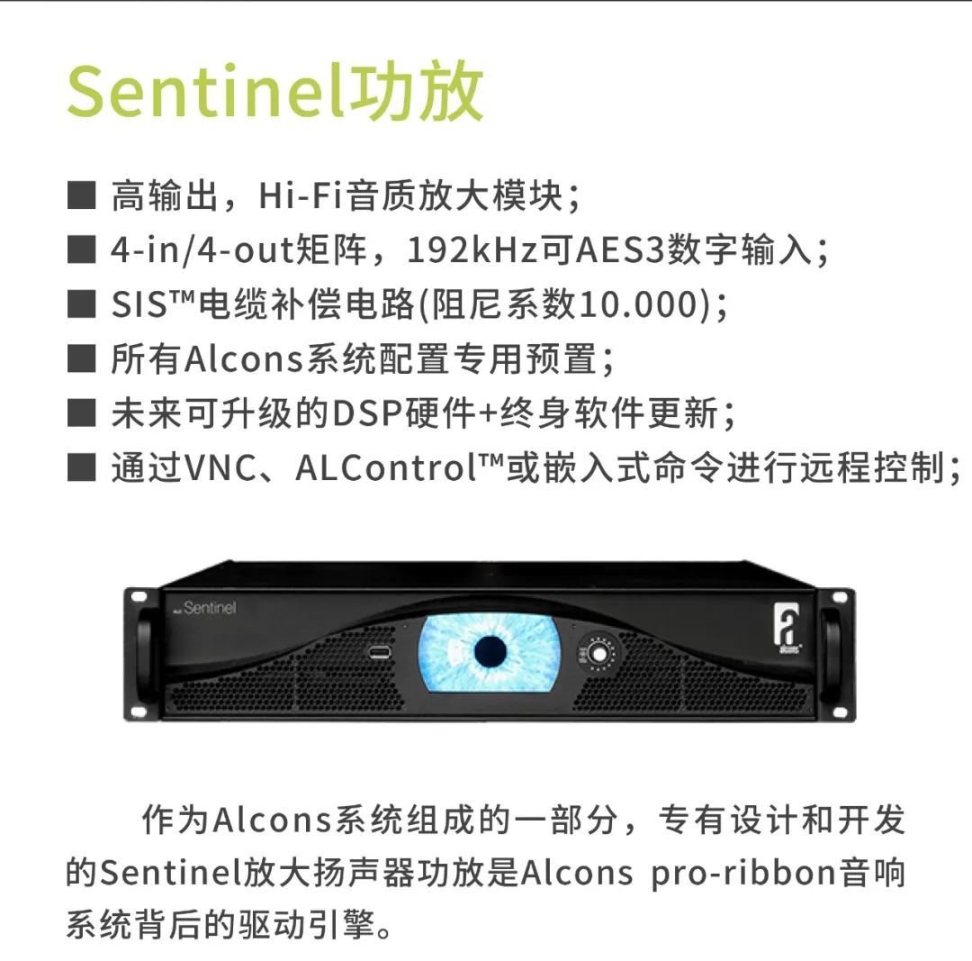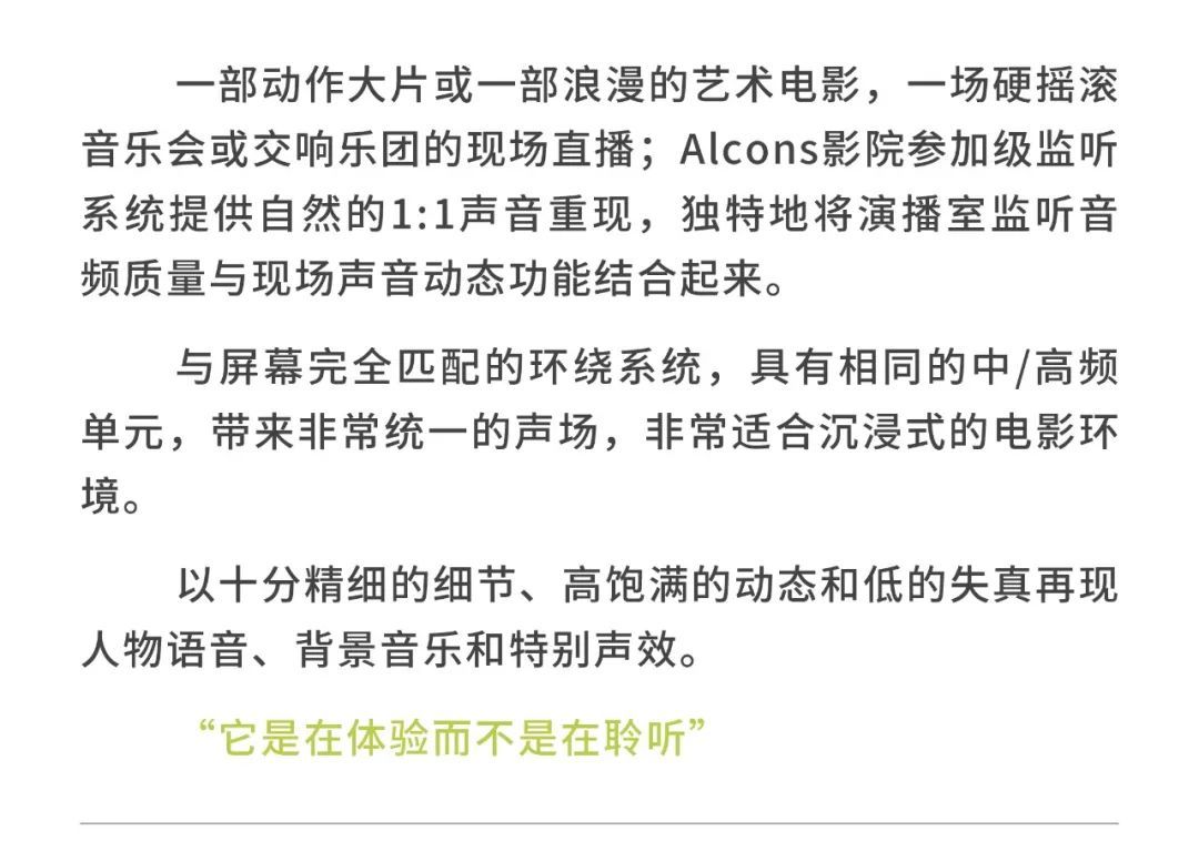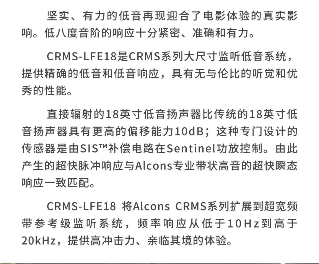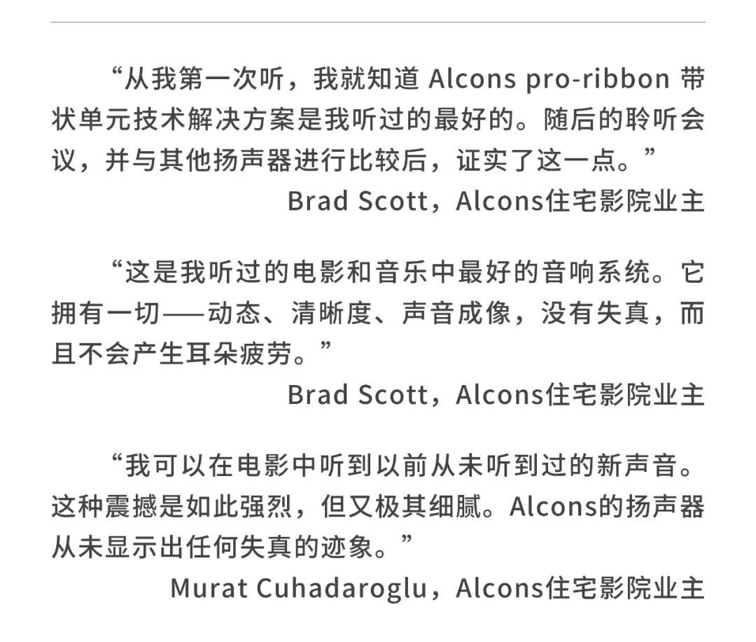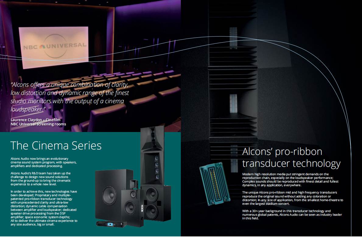 Alcons 公司是歐洲領先的音響系統開發及生產商之一,是著名電影公司NBC環球影業審片室指定品牌。自2002 年公司成立之日起,創始人Tom Back就組建了一支由音頻專家組成的團隊,他們中的每一位都在開發、制造和營銷專業音響系統等方面有著20 年以上的行業經驗。這個經驗豐富的團隊追求音頻技術的藝術之美,確保任一款Alcons 系統完美重現每個音符。所有的揚聲器、功放、處理器都是在工廠內開發生產的,結合了傳統的手工技藝及最新的技術、材料和生產工序。要擁有卓越的音質和穩定的品質是每個Alcons 產品的關鍵,緊湊靈活而智能的解決方案是關注的重點。