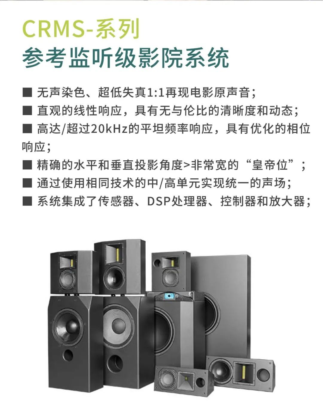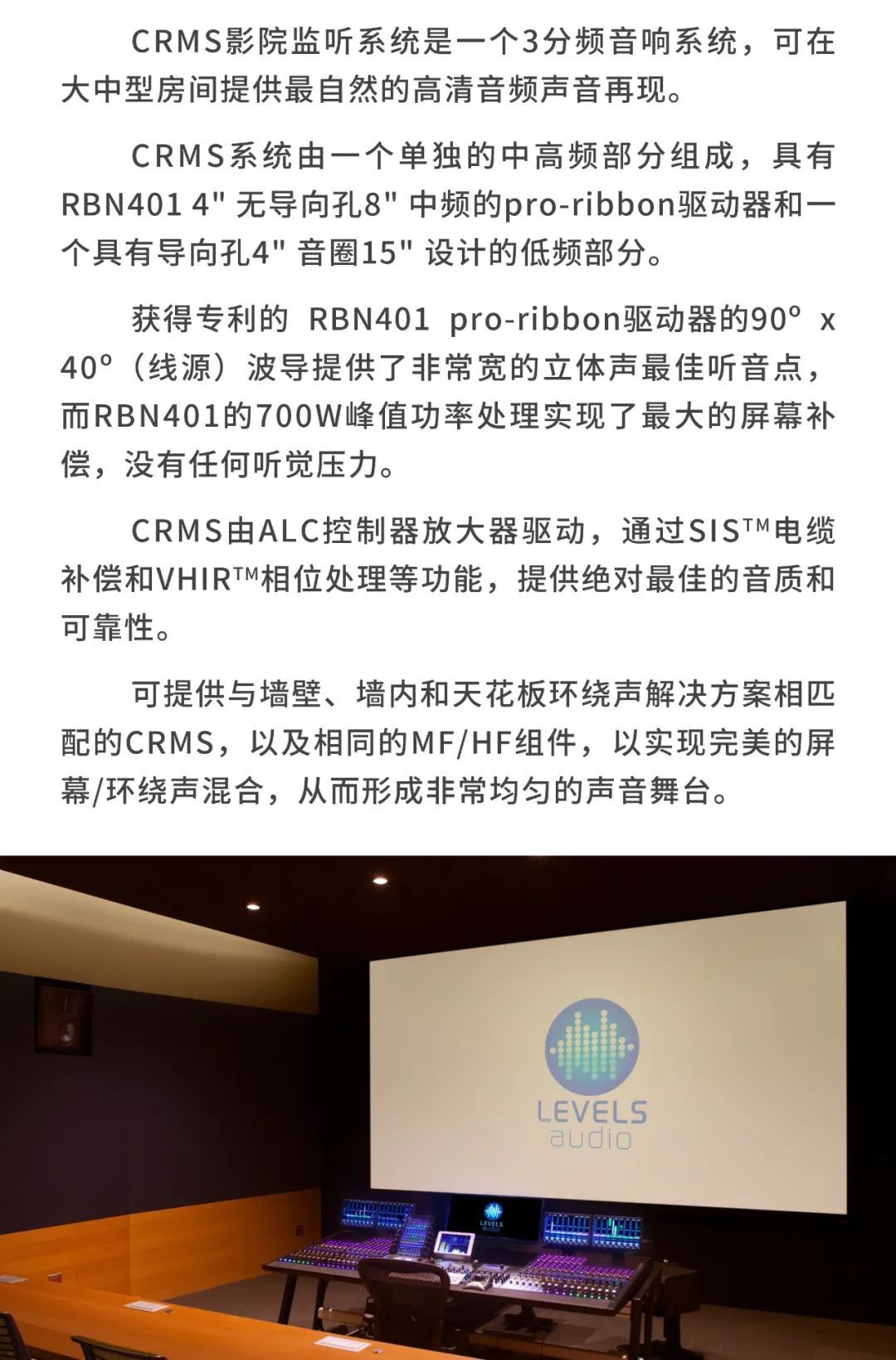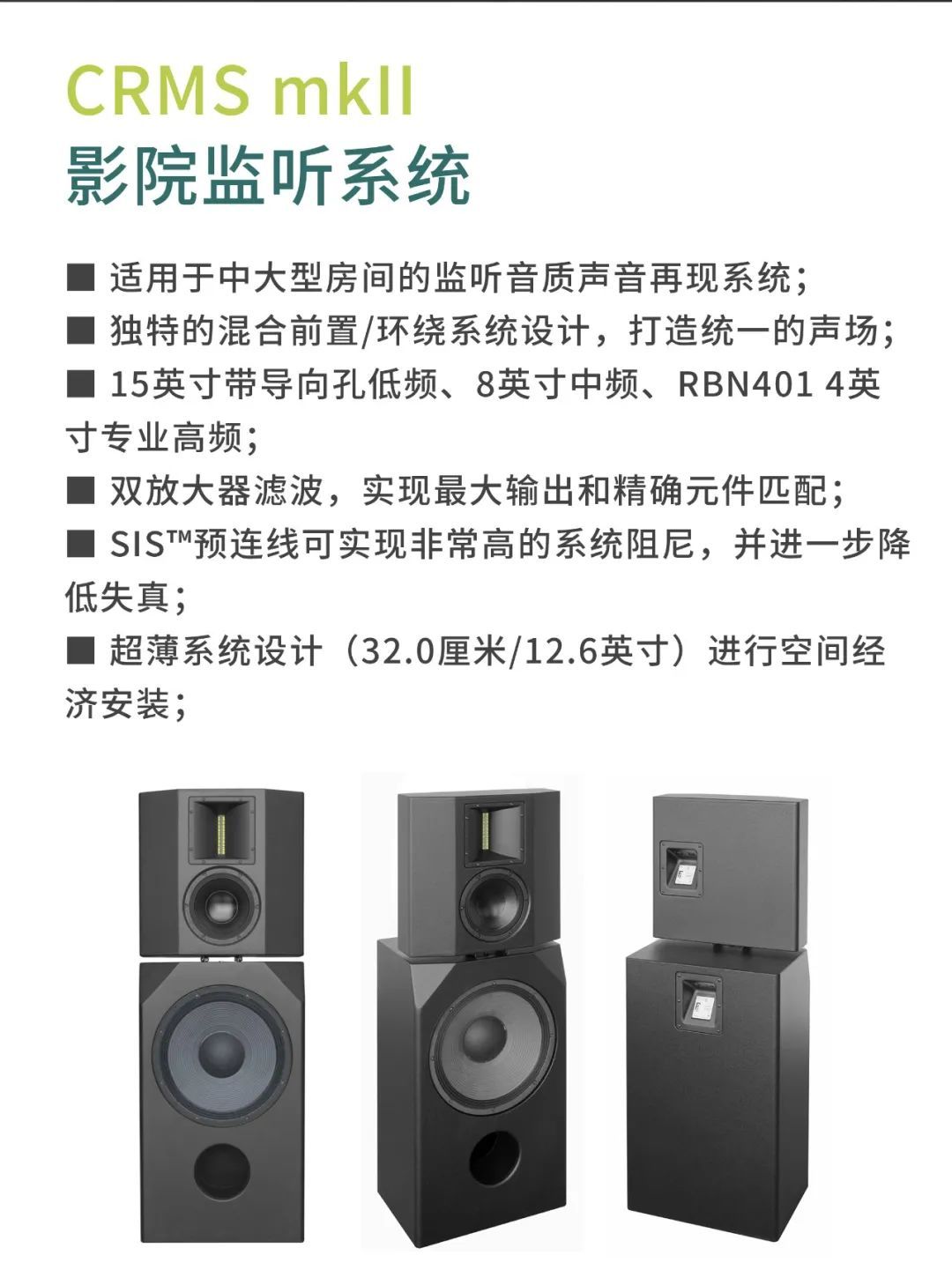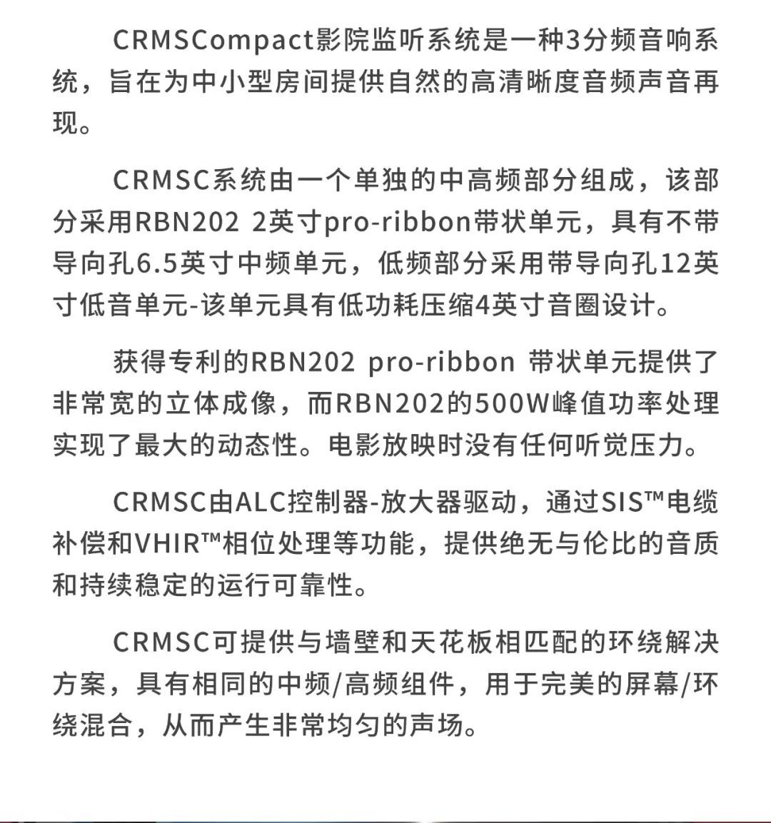 較小的審片室使用CR1影院音箱,包括1個12寸低頻單元以及1個6.5寸中頻單元,音箱厚度僅為18厘米。另外,審片室還配置了CCS8二分頻環繞立體聲音箱以及1只BF181i低音炮。
