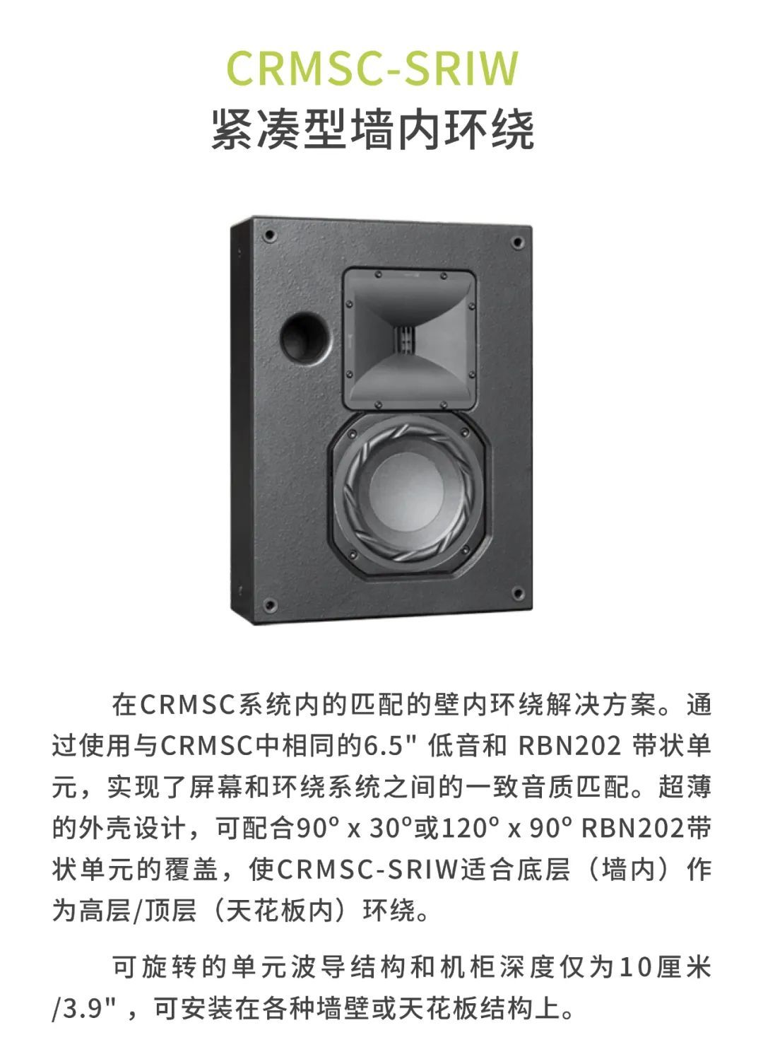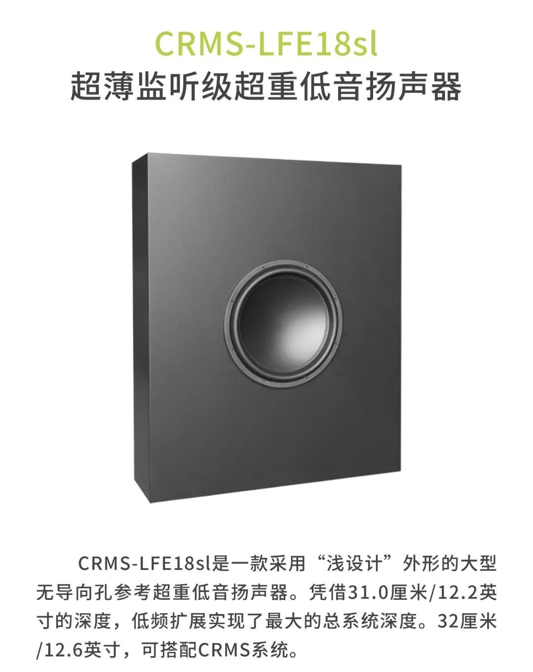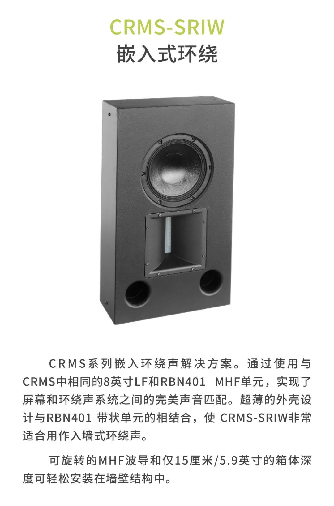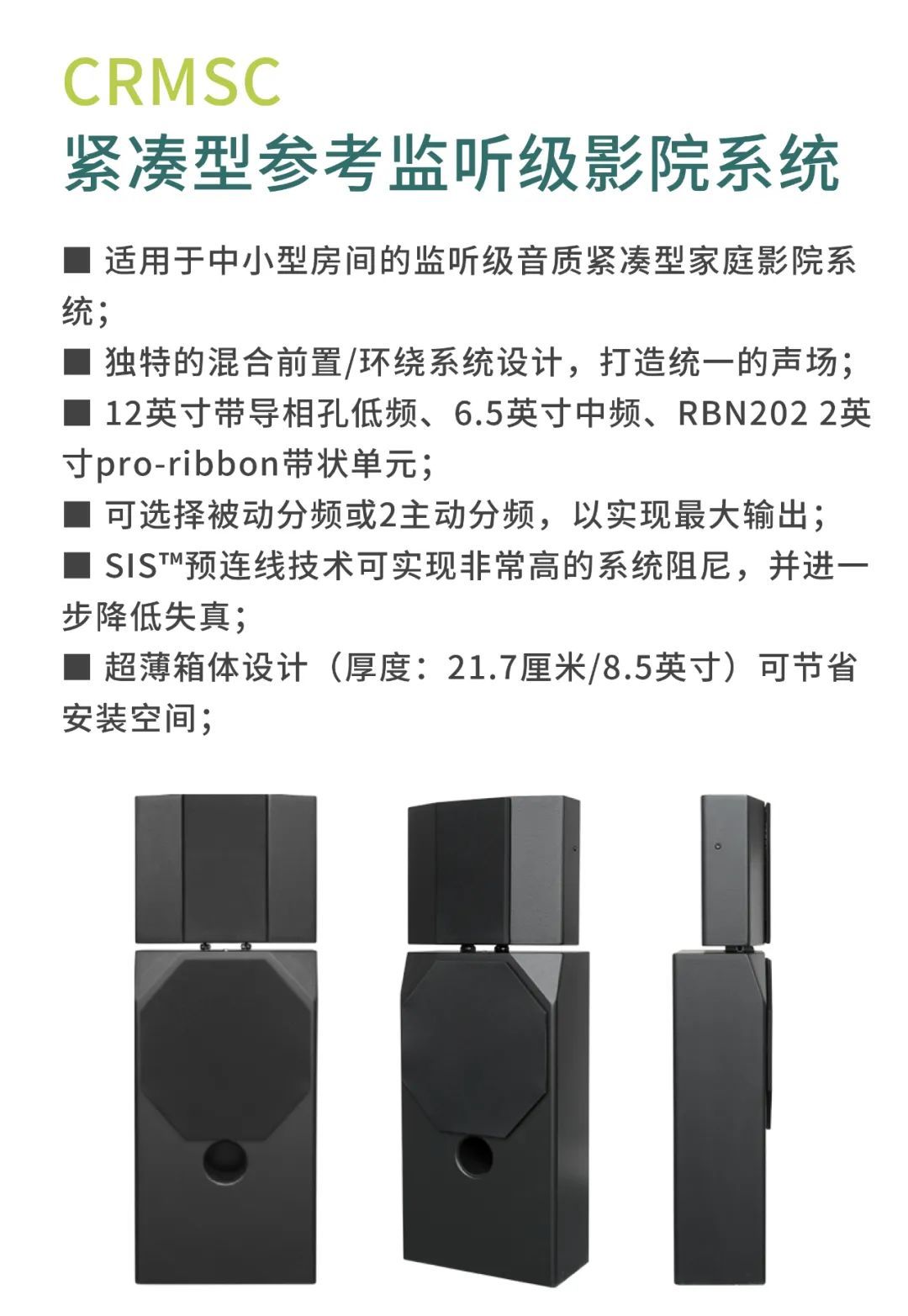 較小的審片室使用CR1影院音箱,包括1個12寸低頻單元以及1個6.5寸中頻單元,音箱厚度僅為18厘米。另外,審片室還配置了CCS8二分頻環繞立體聲音箱以及1只BF181i低音炮。