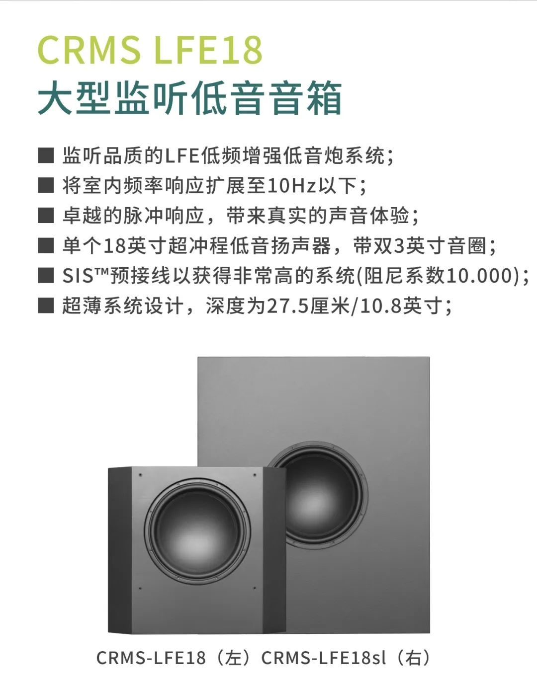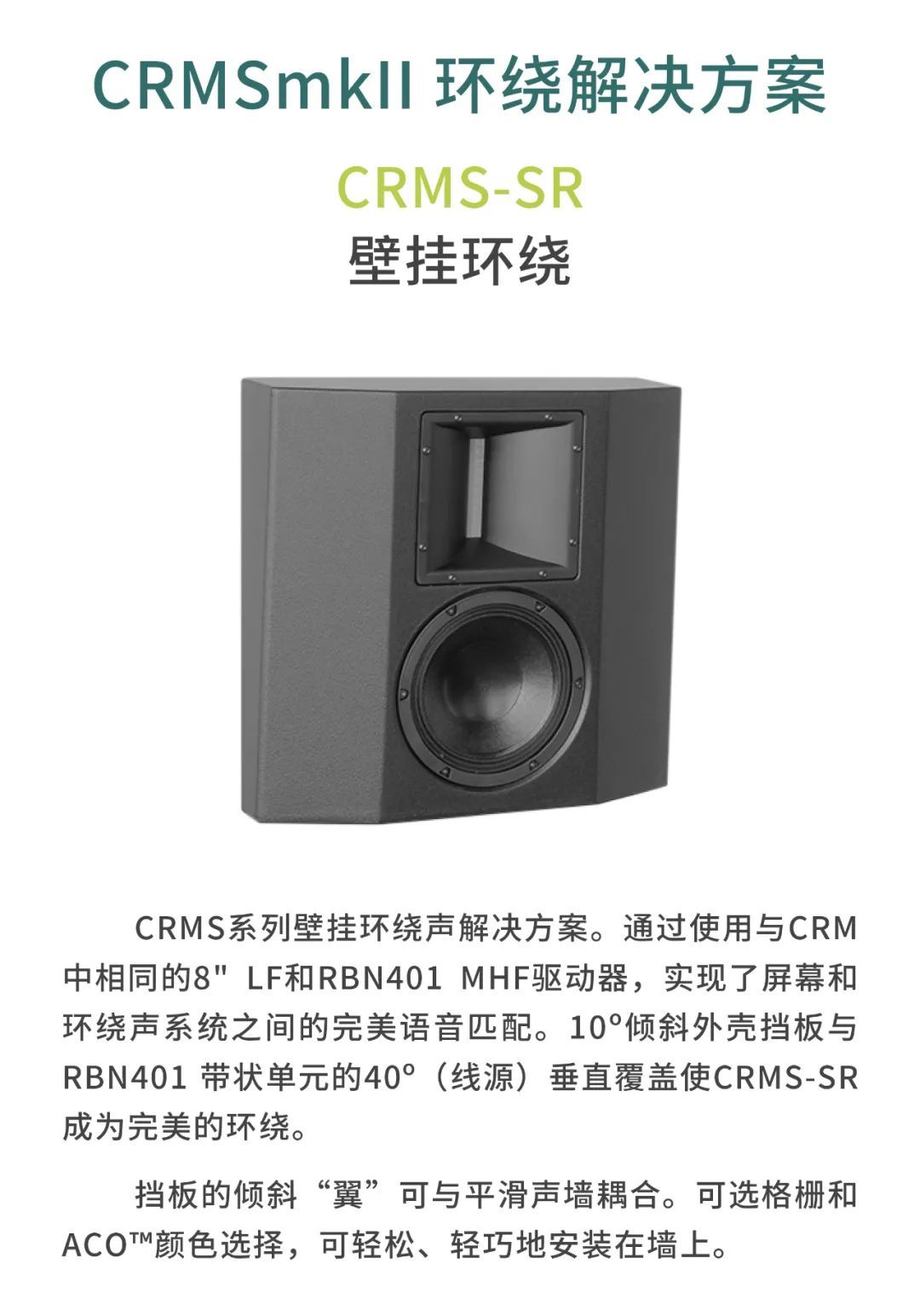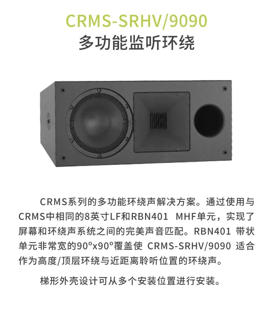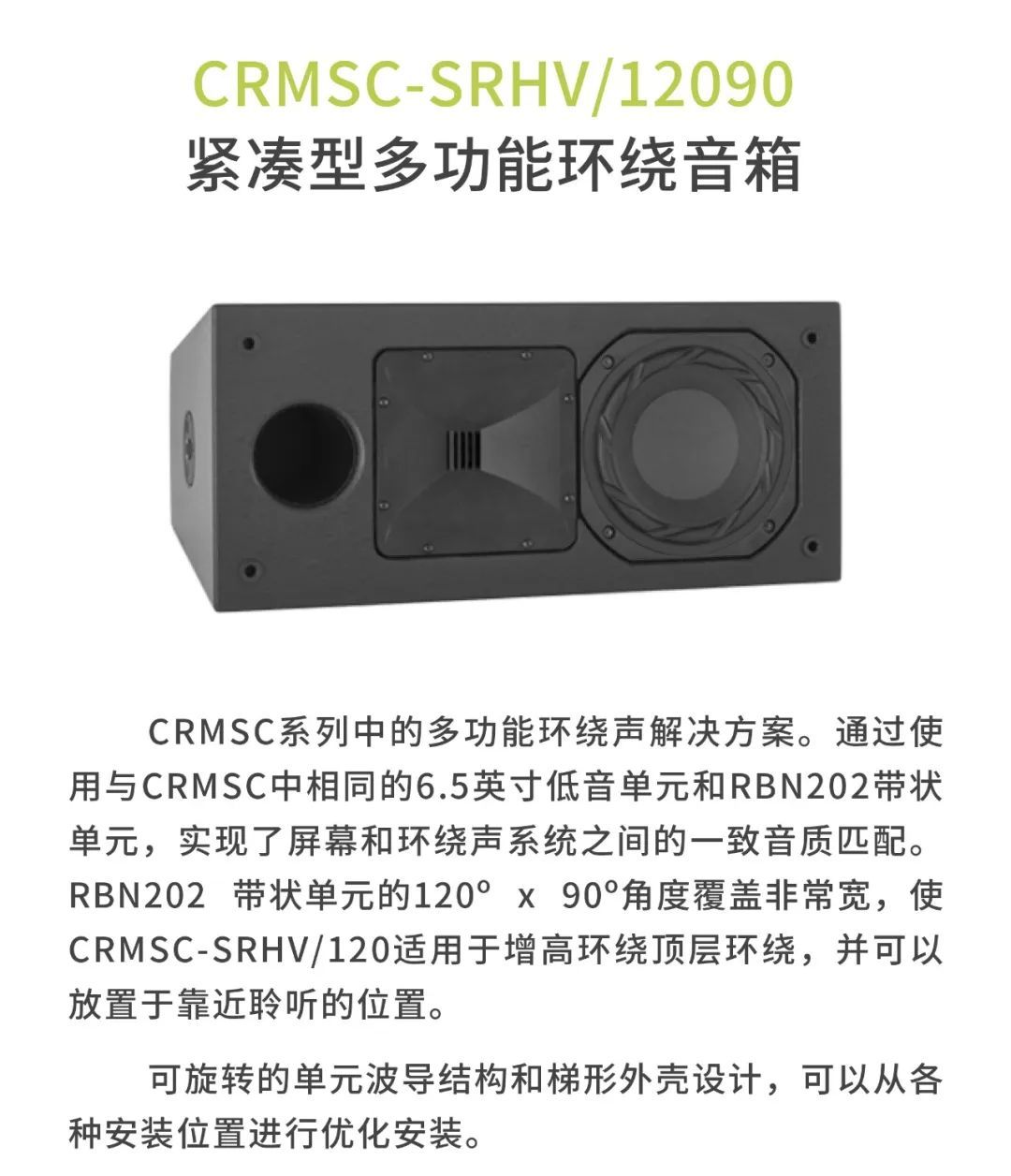 較小的審片室使用CR1影院音箱,包括1個12寸低頻單元以及1個6.5寸中頻單元,音箱厚度僅為18厘米。另外,審片室還配置了CCS8二分頻環繞立體聲音箱以及1只BF181i低音炮。