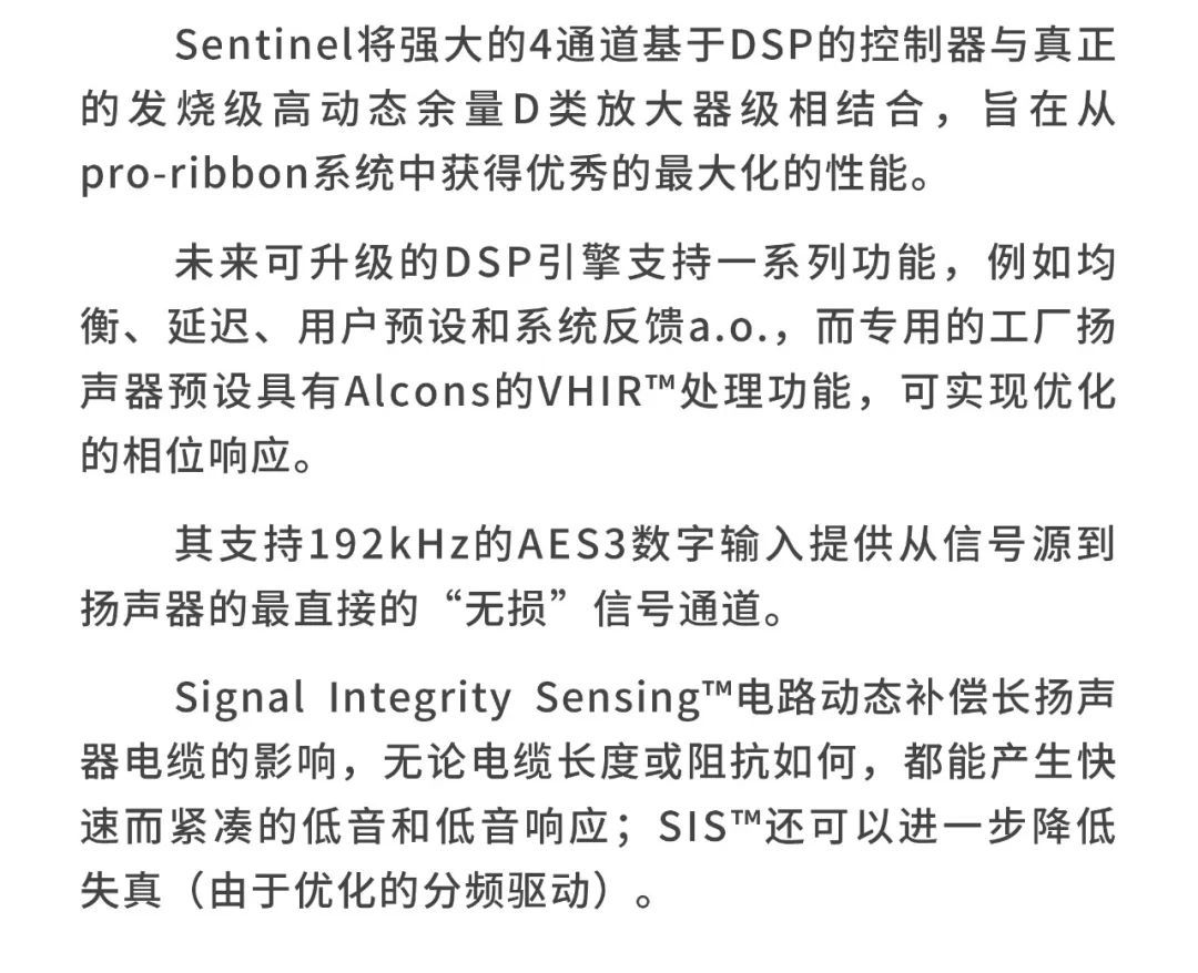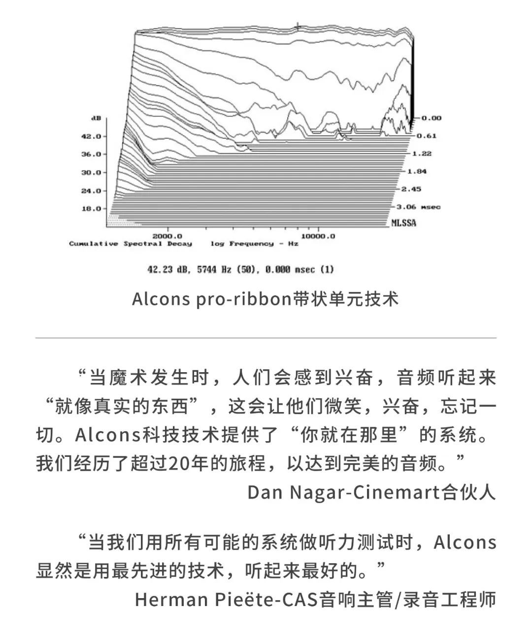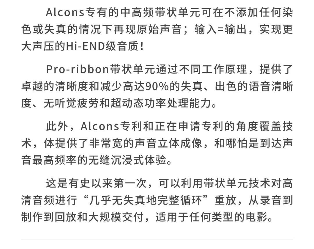 荷蘭Alcons(歐凱仕)在傳感器和音響系統設計方面擁有大量的專業技術,結合了數字信號處理器(DSP)和擴音器技術,形成了其獨特的魅力,鑄造了令人驚嘆的影院產品pro-ribbon 帶狀負載式影院音響系統,Alcons 歐凱仕pro-ribbon 技術,無論從細微聲音或者到大動態的爆炸聲,都能夠不壓縮1:1還原電影原聲,這是全球后期制作室以及全球高標準影院所追求的音響系統。