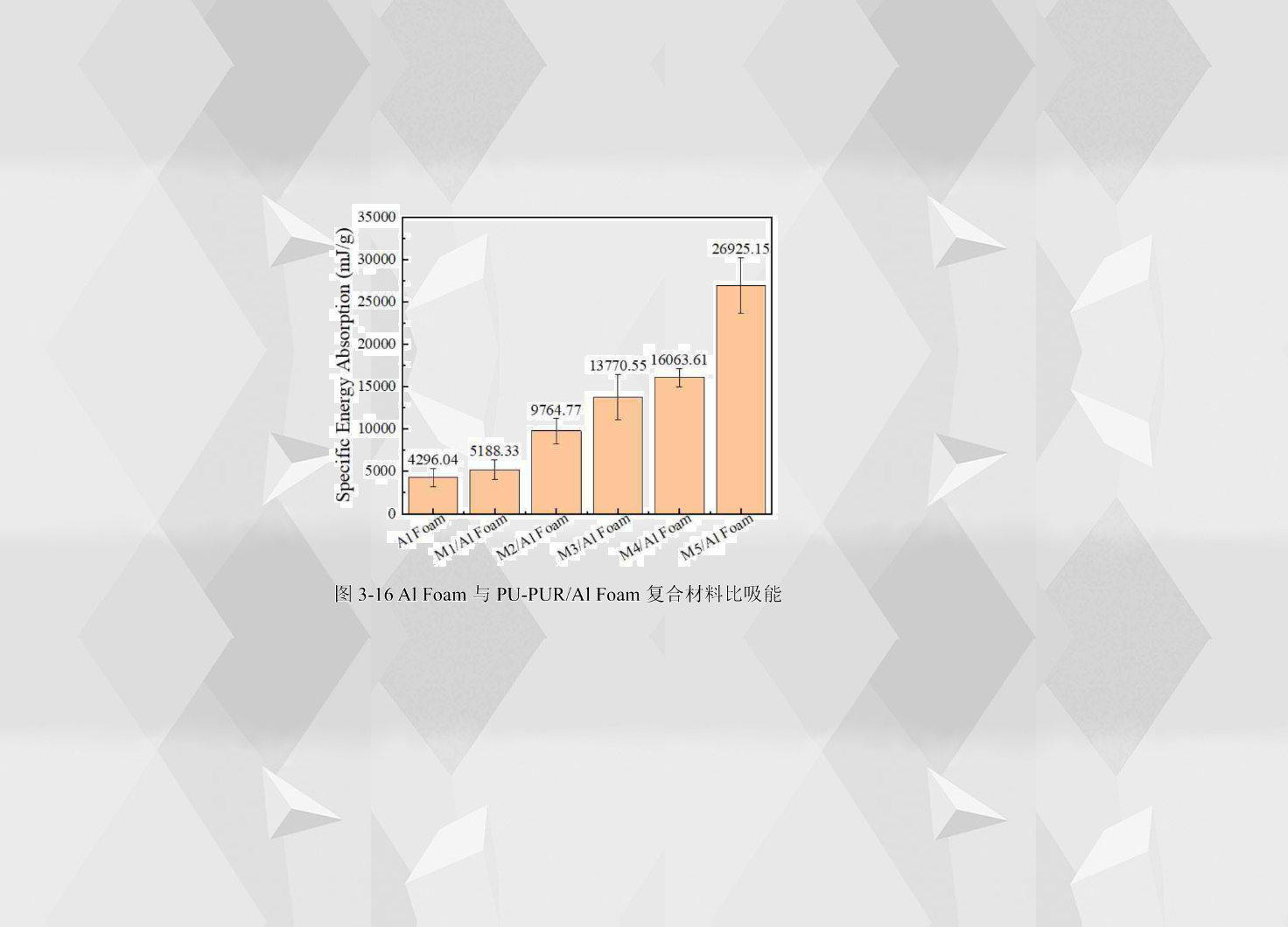 從圖3-16可以看出在泡沫鋁孔洞中填充樹脂后,形成的PU-PUR/Al Foam復合材料的壓縮比吸能都高于Al Foam,也都高于對應的樹脂澆鑄體。Al Foam的比吸能為4296.04mJ/g,而M1/Al Foam的比吸能為5188.33mJ/g, 比Al Foam增加了20.77%。M2/Al Foam的比吸能為9764.77mJ/g,比M1/Al Foam增加了88.20%。M3/Al Foam的比吸能為13770.55mJ/g,比M2/Al Foam增加了41.02%。M4/Al Foam的比吸能為16063.61mJ/g,比M3/Al Foam增加了16.65%。M5/Al Foam的比吸能最高,為26925.15mJ/g,比M4/Al Foam增加了67.61%。從比吸能來看,填充的樹脂中聚脲含量越高PU-PUR/Al Foam復合材料比吸能越大。