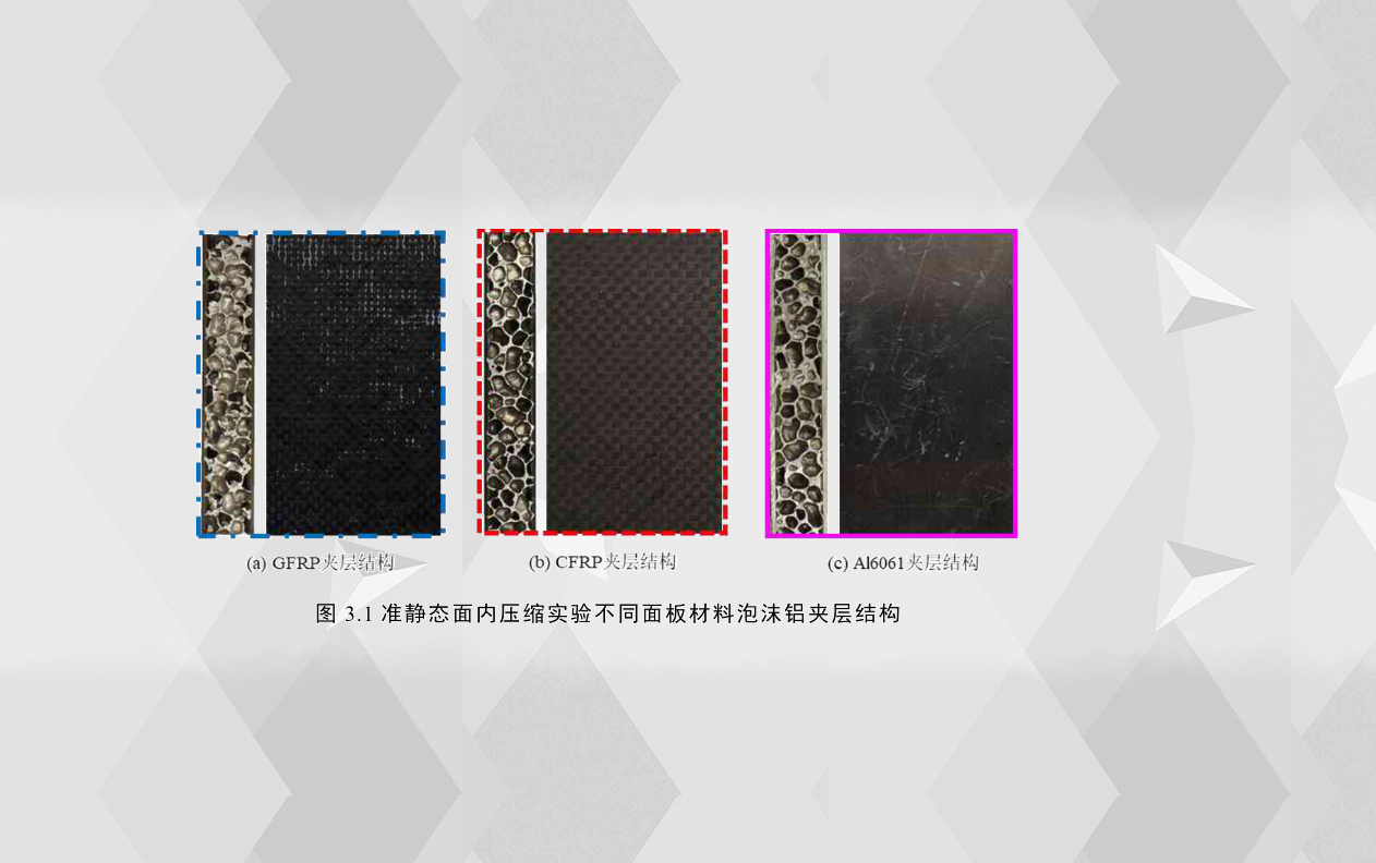 泡沫鋁夾層結(jié)構(gòu)在汽車應(yīng)用中所承載的另一種典型工況為面內(nèi)壓縮,例如泡沫鋁填充引擎蓋、側(cè)門等,例如泡沫鋁填充的前縱梁,當汽車發(fā)生正面碰撞交通事故時,當沖擊速度較大時,引擎蓋、側(cè)門會發(fā)生較大的擠壓面內(nèi)變形,而夾層結(jié)構(gòu)在面內(nèi)壓縮工況下的失效機理和吸能特性也是相當復雜的,為了推動夾層結(jié)構(gòu)在汽車上的應(yīng)用,對泡沫鋁夾層結(jié)構(gòu)在面內(nèi)壓縮工況下全面系統(tǒng)的研究是很有必要的。本章主要通過實驗的方法,揭示了不同配置的泡沫鋁夾層結(jié)構(gòu)在準靜態(tài)面內(nèi)壓縮工況下的結(jié)構(gòu)響應(yīng)機理、失效模式以及耐撞性能,得出何種配置的泡沫鋁夾層結(jié)構(gòu)的耐撞性能更優(yōu),泡沫鋁夾層結(jié)構(gòu)的配置參數(shù)主要包括面板材料、面板厚度、芯層高度和芯層密度。