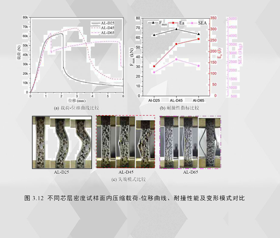 為了分析泡沫芯層密度的影響,選取芯層密度為0.25g/cm3,0.45g/cm3和0.65g/cm3的鋁合金夾層結構作為研究對象。圖3.12(a)和(c)為三種試件的載荷-位移曲線和變形過程的比較,從圖中可以看出,其載荷-位移曲線的相似性相較大。其中AL-D25和AL-D45在第一二階段的變化趨勢基本一致,區別在于前者出現整體屈曲,并且芯層剪切破壞明顯,載荷出現斷崖式下降;而后者的失效模式以面板屈曲為主,芯層并未出現明顯芯層破裂,所以試件整體的仍具備相對穩定的承載能力,雖說載荷也出現大幅度下降,但其下降的坡度遠沒有前者陡。對試件AL-D65而言,其載荷-位移曲線與其他兩個試件的主要差別在于第一階段和第二階段交界處附近載荷出現斷崖式下降,造成這種現象的原因是某一面板出現較大尺寸的屈曲,并伴隨著大面積膠層失效,此面板基本喪失了大部分承載能力,從而導致載荷劇減,而當另一面板再次出現屈曲時,載荷仍然出現斷崖式下降。雖然試件AL-D45也出現了面板屈曲現象,但與AL-D65不同的是,前者的兩面板幾乎同時出現屈曲失效,兩面板的承載能力不至于瞬間減低,雖說承載能力有所下降,但也并未出現斷崖式下跌,而且AL-D45的峰值載荷對應的位移大約在3mm,比AL-D651.3mm更遲,這也從另一方面解釋了前者具有更大的峰值載荷。有趣的是,雖然三者曲線相差較大,但三種試件在第一階段和第二階段的斜率是旗鼓相當的。