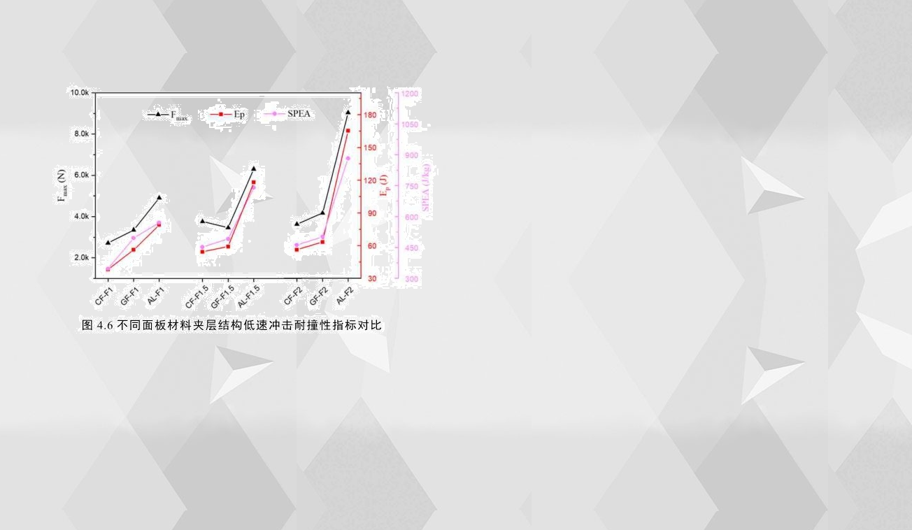 為了更為直觀地比較不同面板材料的夾層結(jié)構(gòu)的抗沖擊性能,圖4.6比較了相同面板厚度但面板材料不同的夾層結(jié)構(gòu)的耐撞性指標(biāo),通過比較可以看出,鋁合金夾層結(jié)構(gòu)有最優(yōu)的耐撞性能,其臨界穿透能高達(dá)118J,初始峰值載荷高達(dá)6297N;而碳纖維增強夾層結(jié)構(gòu)的耐沖擊性能明顯低于鋁合金夾層結(jié)構(gòu)的,其臨界穿透能和初始峰值載荷分別為54J和3752N;而與碳纖維增強夾層結(jié)構(gòu)相比,玻璃纖維的耐碰撞性略有提高,其臨界穿透能為59J。此外,根據(jù)三者完全穿透試件的載荷-位移在第一階段的斜率可以看出,如圖4.5(d),鋁合金夾層結(jié)構(gòu)的斜率最大,也就是說,在低速沖擊工況下,鋁合金夾層結(jié)構(gòu)的剛度大于纖維增強夾層結(jié)構(gòu)的剛度。通過觀察面板厚度為1mm和2mm試件的耐撞性指標(biāo),也可以知道,在低速沖擊工況下,鋁合金夾層結(jié)構(gòu)有最好的耐撞性能,而碳纖維夾層結(jié)構(gòu)的耐撞性能在三者幾乎是最差的。