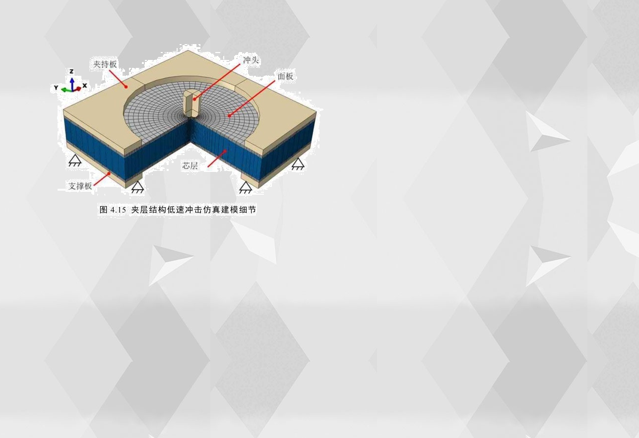 4.5夾層結(jié)構(gòu)低速?zèng)_擊工況下的數(shù)值計(jì)算為了進(jìn)一步了解泡沫鋁夾層結(jié)構(gòu)的低速?zèng)_擊力學(xué)響應(yīng)以及吸能機(jī)理,基于有限元分析軟件ABAQUS/Explicit模塊對(duì)泡沫鋁夾層結(jié)構(gòu)的低速?zèng)_擊試驗(yàn)進(jìn)行仿真建模。由于試驗(yàn)條件限制,未能獲得芯層與面板之間膠層的基本力學(xué)性能,所以只對(duì)未產(chǎn)生明顯界面失效的鋁合金夾層結(jié)構(gòu)的試件進(jìn)行仿真建模;本小節(jié)主要介紹了AL-F1.5試件的建模細(xì)節(jié),比較了實(shí)驗(yàn)和仿真的載荷-位移曲線及失效模式,驗(yàn)證了模型的準(zhǔn)確性,最后分析了夾層結(jié)構(gòu)各組成部分的吸能特點(diǎn)。