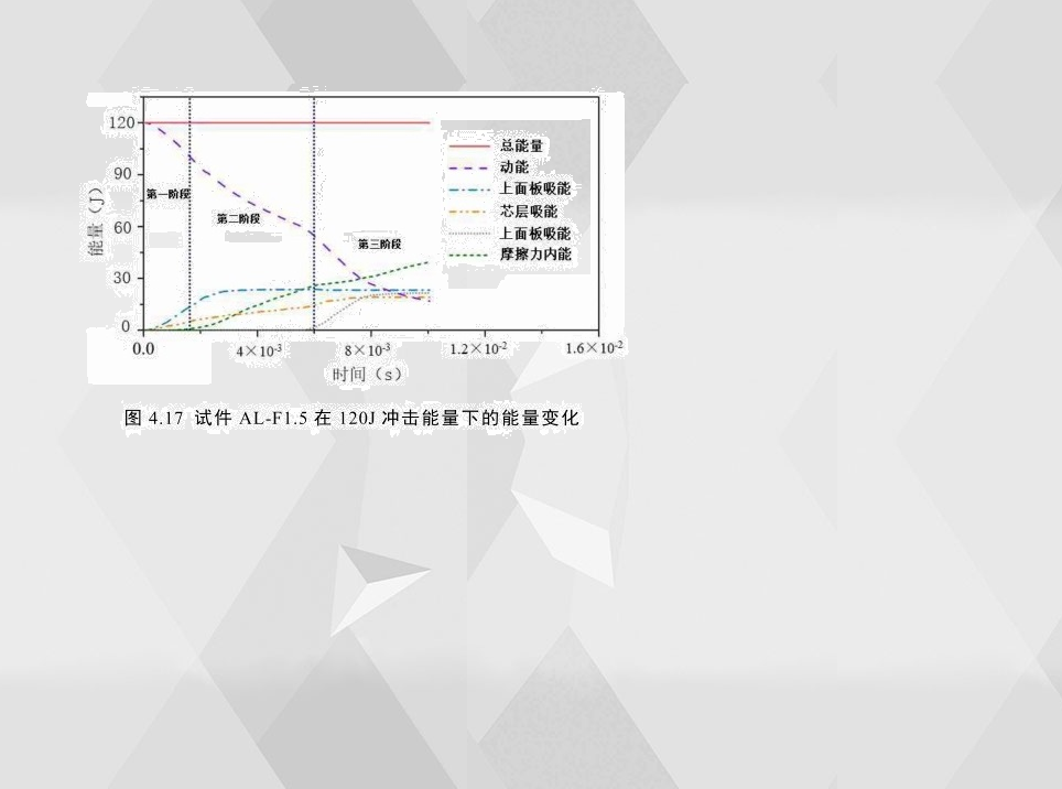 4.17為試件AL-F1.5的各組成部分在低速沖擊仿真中能量變化。從圖中可以看出,初始沖擊能量主要由上下面板、泡沫鋁芯層的內能以及各組成部分的摩擦能四部分組成。從各部分能量轉化趨勢可以看出,整個沖擊過程基本可以分為三個階段。第一階段主要由上面板吸收能量,摩擦力做功較少。第二階段摩擦力做功迅速增加,成為主要吸能部分。第三階段由于下面板發生較大塑性變形,下面板成為主要吸能部分。
